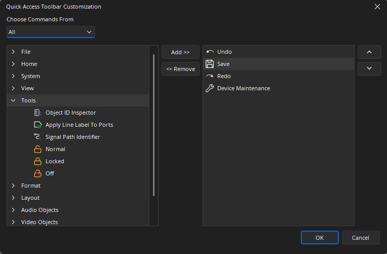 Icons for specific feature selections may be added to, or removed from, the column on the right using the Add and Remove buttons on this menu. Use the Up and Down arrow buttons to change the order of the icons in the right column. Hit OK to confirm the selection and order of each Icon in the right column. These will be available in the Quick Access Toolbar along the top left edge of the window (or below the ribbon if that option has been selected).