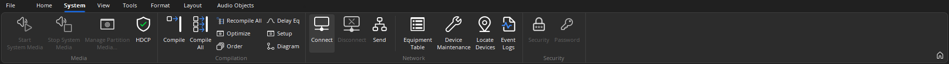 The main functions of Tesira software are accessible via a Ribbon interface at the top of the window. This interface is structured by tabs along the top of the ribbon, each revealing a new ribbon menu containing different sets of tesira functions while selected.