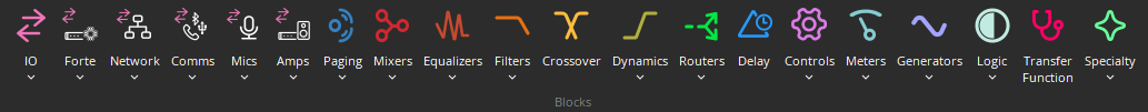 In addition to audio DSP blocks, the Audio Object Bar provides the selection pointer (cursor) and text graphic elements. The selection pointer is the default selection for the application. Text Graphic Element can be placed in the layout just as the audio DSP blocks. The text can be edited by a right-click on the graphic element and then choosing Edit Text from the drop-down menu.