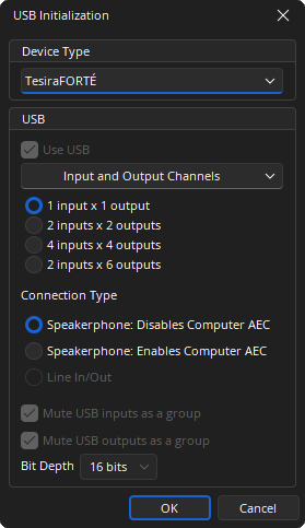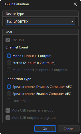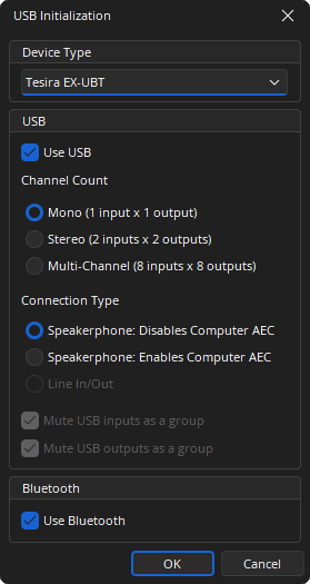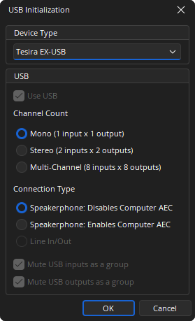 When the Tesira EX-USB is selected from the Device Type drop-down menu, the EX-USB Initialization dialog window displays.