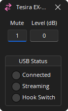 Connected: 3rd party devices connected to the EX-UBT display in the Connected field. Device controls the EX-UBT audio levels and muting.