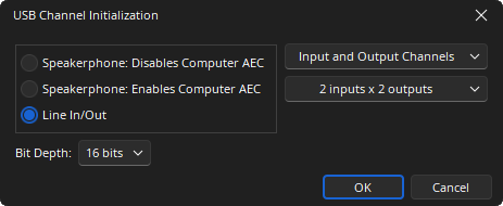 If the 'Use USB' option is selected from a FORTÉ X Audio Object Initialization the following dialog is displayed. The options available in this initialization operate as described in the USB initialization overview above.