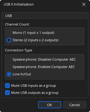 Mute USB Outputs as a Group: Mutes all USB X output channels when the mute state of a single output channel is changed. Once checked, this selection cannot be deselected if either of the Speakerphone USB X terminal types is selected. It is checked by default if the Line In/Out USB X terminal type is selected.
