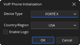 The VoIP Phone provides support for IP phone systems. When the VoIP phone is selected from the Object Toolbar, an initialization dialog is displayed.