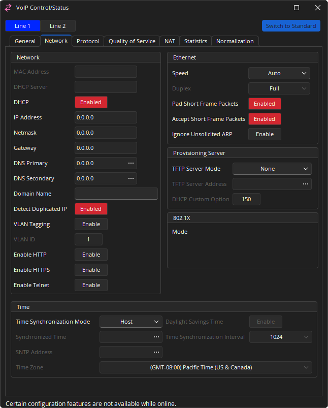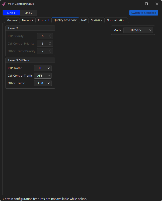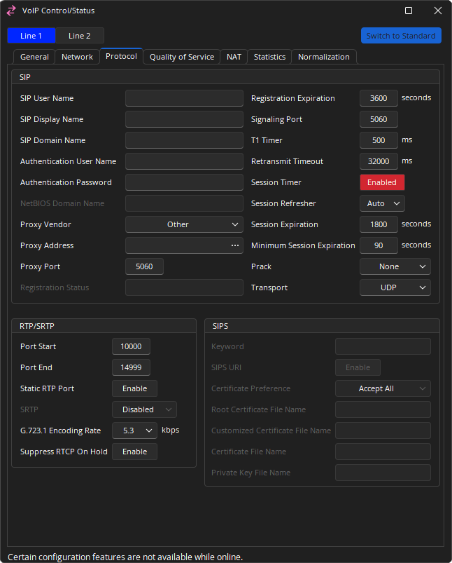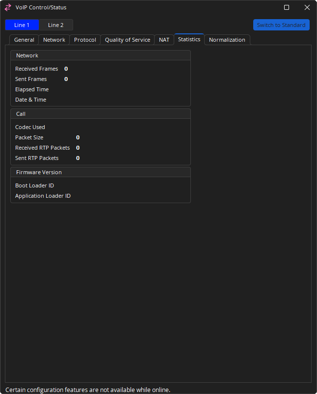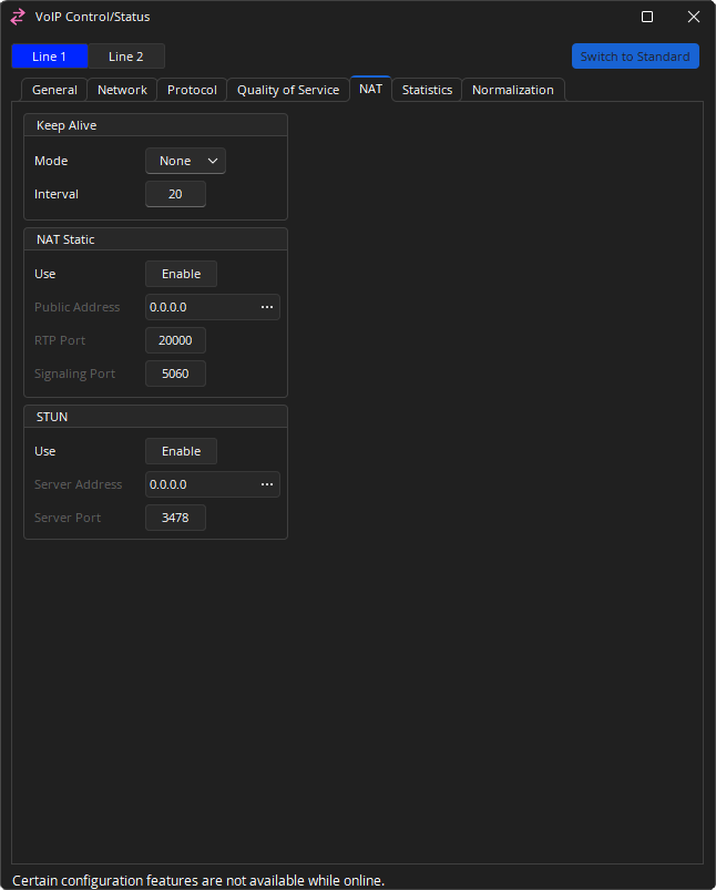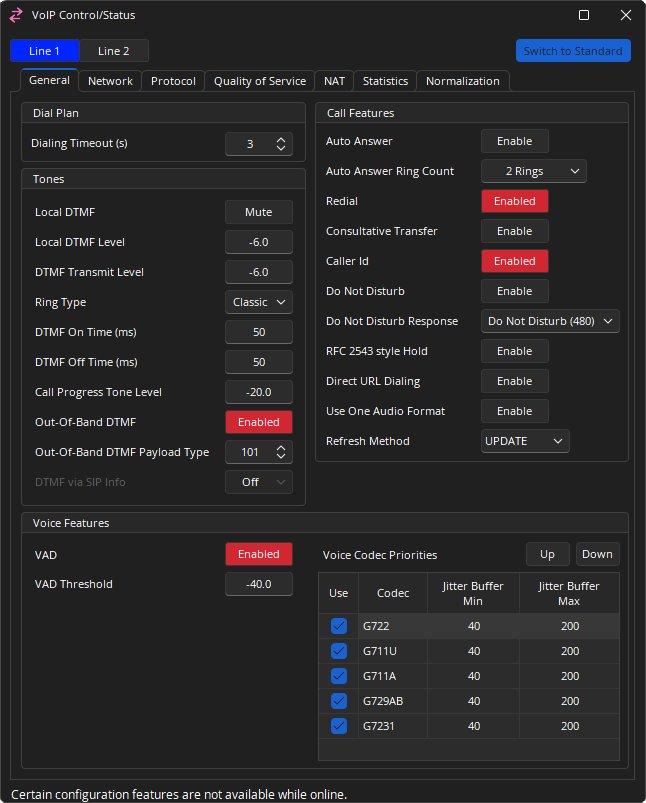 The VoIP Control/Status features a view toggle that switches between standard and an advanced viewing mode. The standard view contains information and options relevant to most VoIP implementations. Advanced view allows selection and customization of more complex VoIP options. Some items may be modified while connected to the system while others may require being offline to be modified.