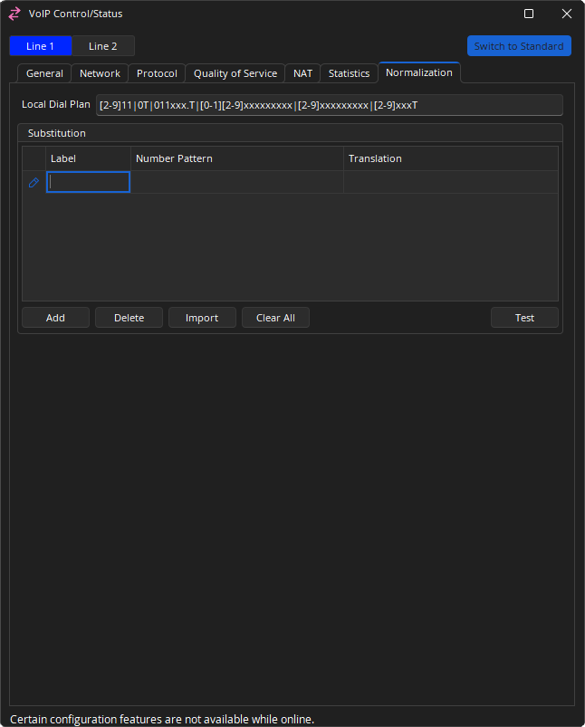 Substitution: Microsoft Lync/Skype For Business uses .NET Framework regular expressions to specify numeric match patterns that the server uses to translate dial strings to E.164 format for the purpose of performing reverse number lookup. The substitution dialog allows the definition of similar normalization rules to allow the Tesira VoIP card to automatically translate the dialed digits to E.164 format. Multiple rules can be defined. Each rule includes a label, a matching pattern, and a translation pattern. The rules are based upon lines.