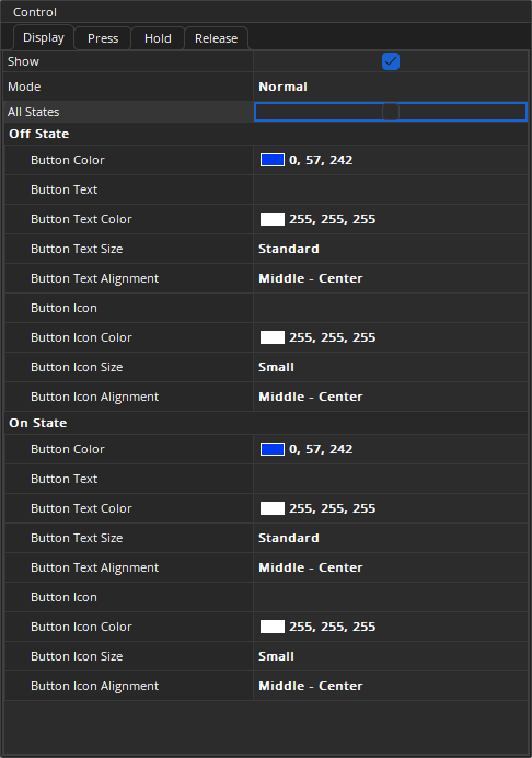 The Control subsection is composed of four tabs: Display, Press, Hold, and Release. These sections are detailed below.