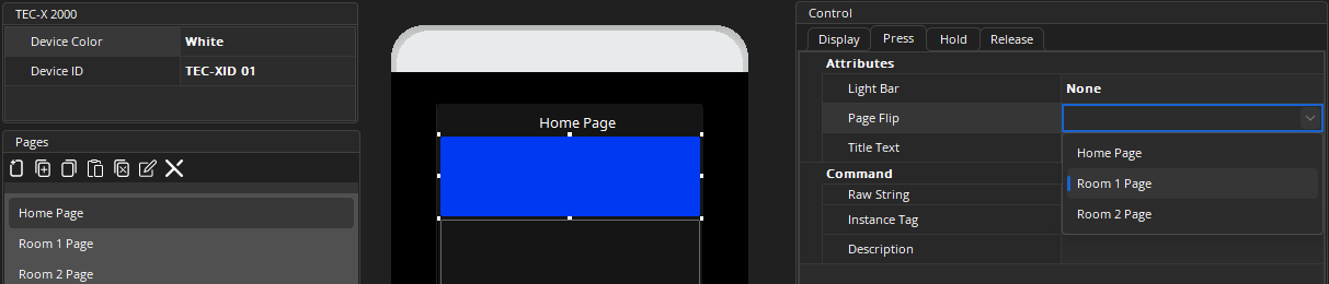 A page flip button allows the user to move from the current page to a page selected from the Page Flip drop-down. Each page in a multi-page configuration needs to have at least one Page Flip button to navigate between pages.