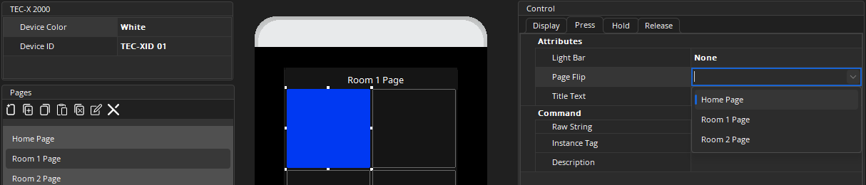 To switch between pages each page must have buttons assigned with Page Flip actions. Only Press and Release tabs may be assigned as page flip buttons.