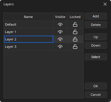 Provides an editable table of Layer properties. Layers can be used to separate a Layout into multiple parts. The Layers can be organized with regards to object types, system segments, or any other criteria. The Default Layer always remains, but other Layers may be created or removed.