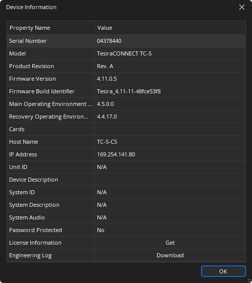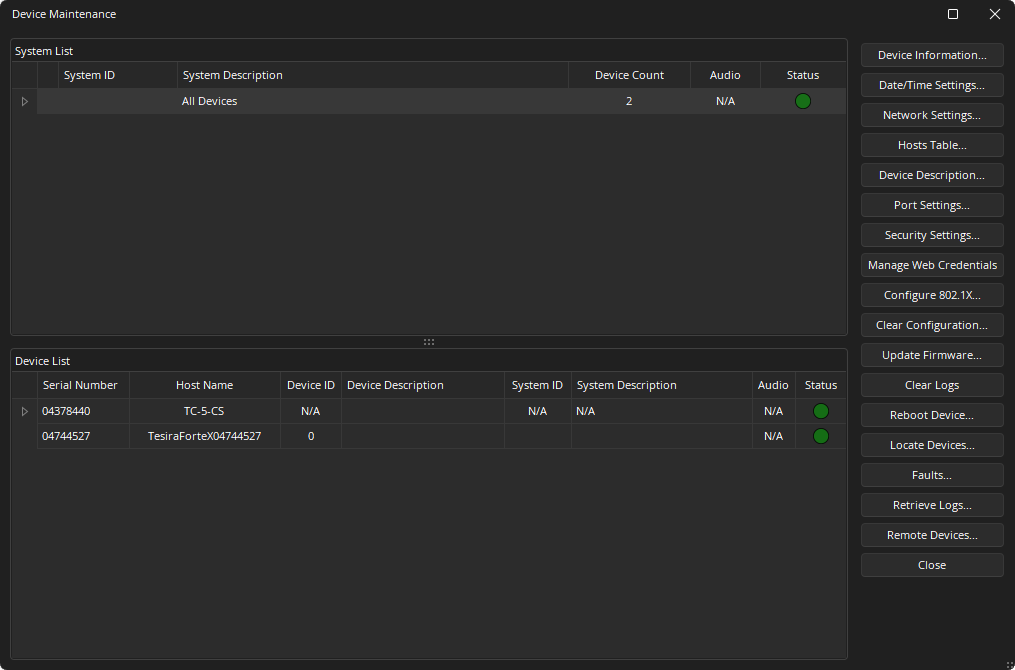 Provides information on the discovered devices. Selecting a system from within the System List will limit the Device List to only show details of the devices contained in that system. Includes Serial Number, Host Name, Device ID, Device Description, System ID, System Description, Audio, and Status information.