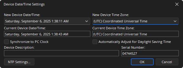 Used to configure time zone, daylight savings time adjustments and NTP (Network Time Protocol) servers. The date and time can be manually set or the unit can be synchronized to the clock of the host PC. Multiple devices clocks may be set at the same time. Consecutive devices may be set by selecting the first device then holding the Shift key then selecting the last device. Non-consecutive devices can be set by holding the Control (CTRL) key and individually choosing the desired devices. The default NTP server is time.biamp.com.