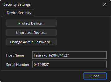 Manage Web Credentials allows resetting the username and password required to access web-based functions in Tesira, such as the Event Scheduler. User is reset to admin. Password is reset to the device serial number.