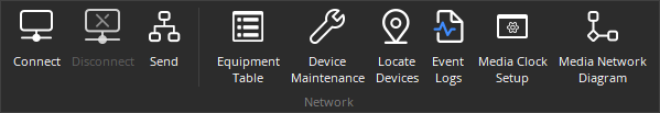 Provides the ability to Connect, Disconnect, and Send configuration to a Tesira system. See System Considerations. for additional information about using these features. Network is also used to access system management tools, detailed below.