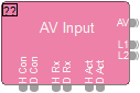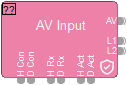 The AV Input block serves as an interface to accept a video and audio stream input. The block represents inputs from a TesiraLux IDH-1 to AV network streams.