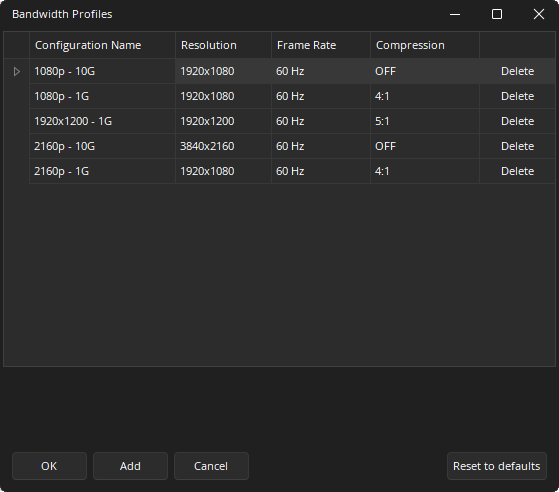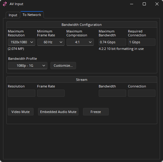 Allows quick setting of the bandwidth attributes based on the expected source material type. Clicking the “customize” button will bring up an additional dialog that allows adding or modifying the list of known profiles. Changing one of the existing entries’ resolution, frame rate, or compression will modify all AV input blocks in the current layout to match the new settings. Bandwidth settings may be exported using the Export AV Bandwidth Settings option from the File menu.
