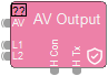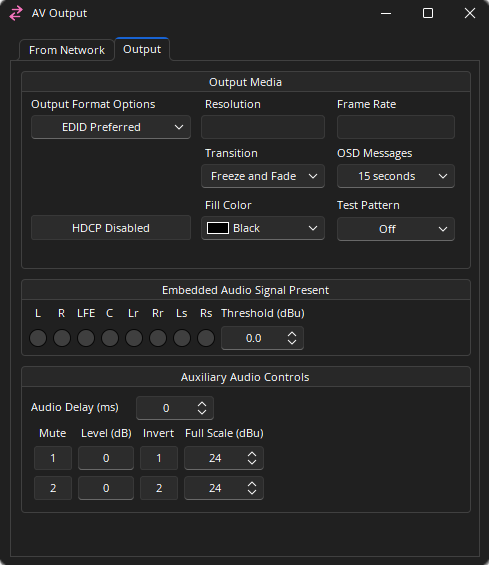 The AV Output Block serves as an interface to process and/or route video and audio streams from the network to an output. The block represents the conversion of AV network streams to wired outputs on a TesiraLUX OH-1.
