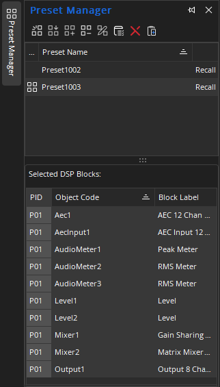 Add Selected DSP Blocks: To add DSP objects to a preset, first select the preset in the upper field of the Preset Manager View Sheet (mouse click). Select one or more DSP objects in the DSP layout (CTRL+mouse click for multiples) so that each desired object is highlighted. Click the Add Selected DSP Blocks Icon to add the selection to the list of objects being controlled. The object(s) can also be selected and added to the list by holding CTRL while dragging the selection to the list from the layout.