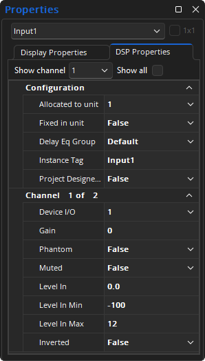 Most DSP Attributes are duplicate functions found in an individual component's Control Dialog, as detailed in the Audio or Video object tabs. The Configuration functions that are not available in an object's control dialog are detailed below.