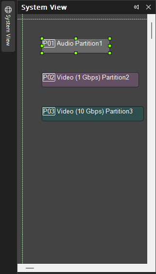 The System View Layout shows the partitions included in a system, how they connect, and the Audio & Video routing between them.